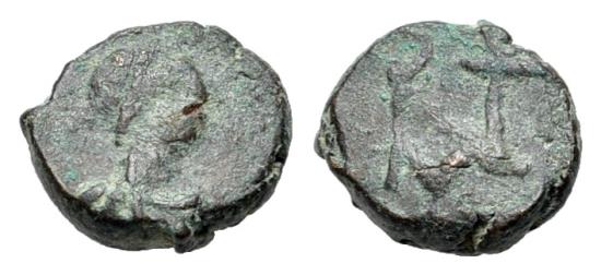 Anastasius I (491-518). Æ nummus (9mm, 1.09g, 6h). Constantinople, 491-498. Diademed, draped and cuirassed bust of Anastasius I to r. R/Monogram of Anastasius within simple wreath. DOC 15, MIBE 40, Sear 13. VF