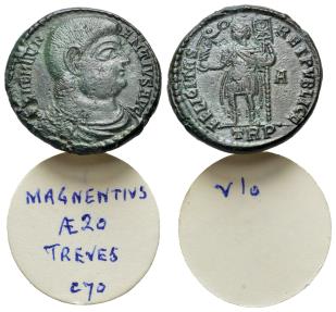 Magnentius (350-353). Æ 22mm. Treveri, 350. R/ Emperor standing