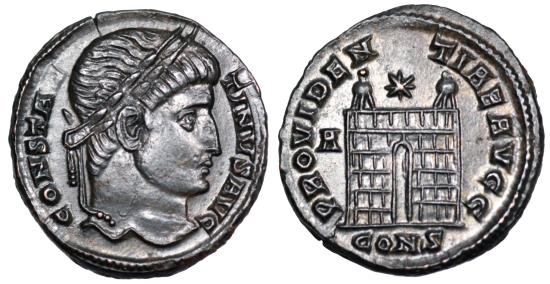 Constantine I A.D. 326-327 Ӕ nummus 19mm 3.4g CONSTANTINVS AVG; Laureate head right. PROVIDEN-TIAE AVGG; camp gate, two turrets, no doors, • in archway, ✶ above; in left field A. in ex. CONS RIC VII Constantinople 7