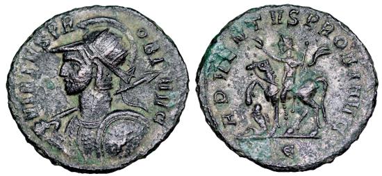 VIRTVS PROBI AVG; radiate, helmeted and cuirassed bust left holding shield with horseman and spear.