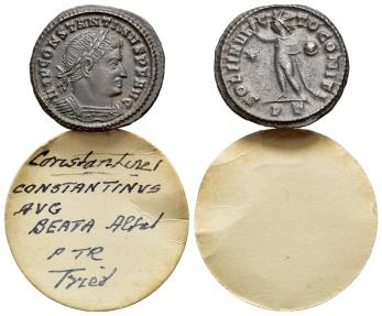Constantine I 'the Great' (307-337). BI Nummus (20mm, 3.38g, 12h). Ticinum, AD 313-314. Laureate and cuirassed bust to r. R/ Sol wearing chlamys standing to l., holding globe and raising hand; star in l. field, PT in exergue. RIC VII 8. Near EF