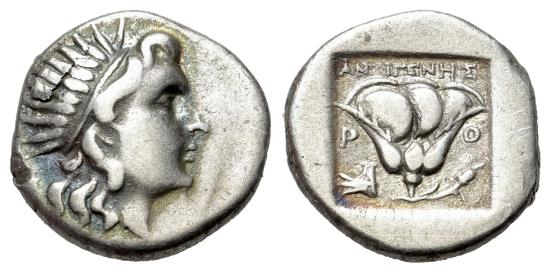 | Islands of Caria, Rhodes, c. 188-170 BC. AR Drachm. Antigenes, magistrate. Radiate head of HELIOS R/ ROSE |