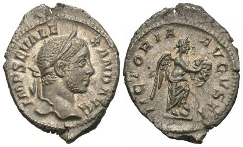 Victory standing right, left foot on helmet, inscribing VOT / XX on shield set on knee.