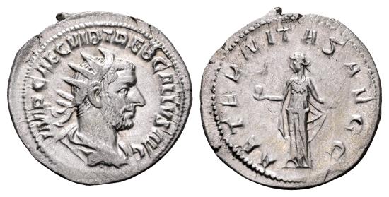 Rome, 253 AD. AR antoninianus, 3.69 gr., 22.7 mm. Obv.: IMP CAE C VIB TREB GALLUS AUG; radiate, draped and cuirassed bust of Trebonianus Gallus to the right. Rev. AETERNITAS AUGG; Aeternitas standing to the left, holding phoenix on globe in her right hand and raising her skirt with her left. Ref.: RIC 30. Good Very Fine. |