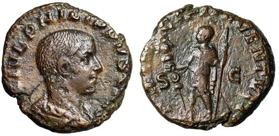 PHILIP II CAESAR AE AS Rome Mint 244-246 AD Obverse: M IVL PHILIPPVS CAES, draped bust right Reverse: PRINCIPI IVVENTVTIS Philip II Standing left, holding standard and spear; S-C in fields References: RIC 258b Rare Size: 23mm, 9.00g Professional Numismatic Notes: Very-fine and a rare denomination for Philip II!