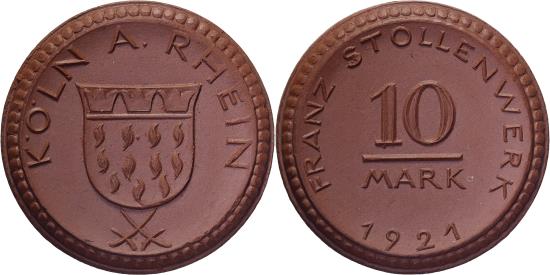 | | Weimar Republic, Stadt Köln, 10 Mark, 1921, , Porcelain | | | FEATURES |