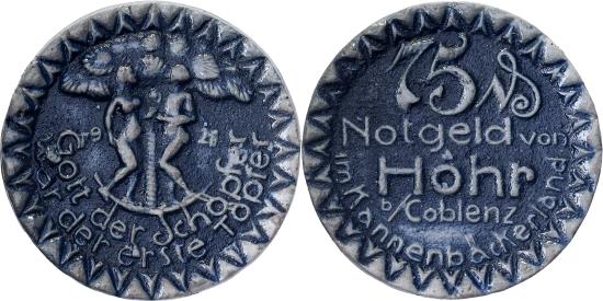 | | Weimar Republic, Municipality of Höhr, 75 Pfennig, 1921, MS(63), Porcelain | | | Rare mintage of 3000! | | FEATURES |