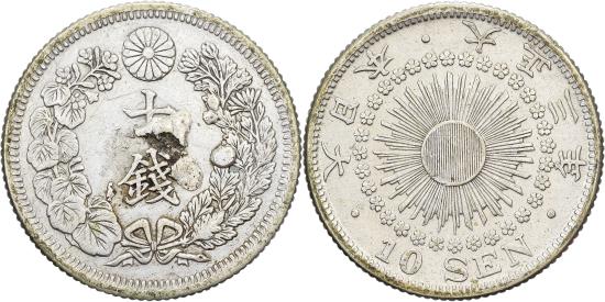 | | Japan, Yoshihito, 10 Sen, Taishō Era, Yr. 3 (1914), Silver, | | | Traces of an old jewelry welding on the obverse. | | FEATURES |