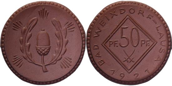 | | Weimar Republic, Municipality of Weixdorf, 50 Pfennig, 1921, , Porcelain | | | FEATURES |