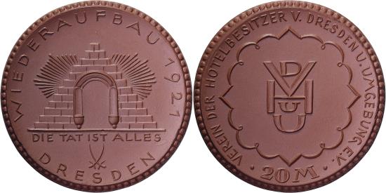 | | Weimar Republic, Stadt Dresden, 20 Mark, 1921, , Porcelain | | | FEATURES |