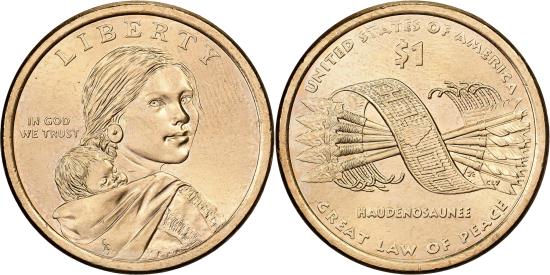 | | United States, Dollar, Native American Dollar - Hiawatha belt reverse, 2010 | | | Native American Dollar - Hiawatha belt reverse, Sacagawea bust right with baby on back, Hiawatha belt and bundle of five arrows, Date and mint mark on edge | | FEATURES |