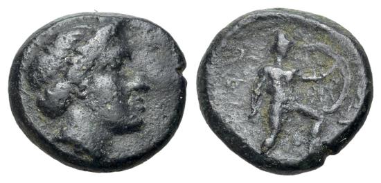 | Thessaly, Trikka, c. 400-344 BC. Æ Chalkous (13mm, 2.36g, 3h). Head of nymph r. R/ Warrior, holding shield and spear, advancing r. Cf. BCD Thessaly 787; HGC 4, 339. Dark patina, VF |