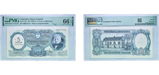 Argentina Federal Republic ND (1969-1971) 5 Pesos (Overprint on 500 Pesos) Paper (Chalcographic) Gem Uncirculated EPQ 66 P 283