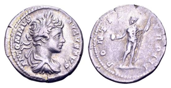 Caracalla AD 198-217, AR Denarius (19 mm, 2.99 gram) Rome 200 ANTONINVS AVGVSTVS Laureate, draped and cuirassed bust r. PONTIF TR P III Caracalla, laureate, nude but for chlamys over l.shoulder, standing to front, head l., holding globe and spear, sword strapped to his back RIC 30b. Very fine