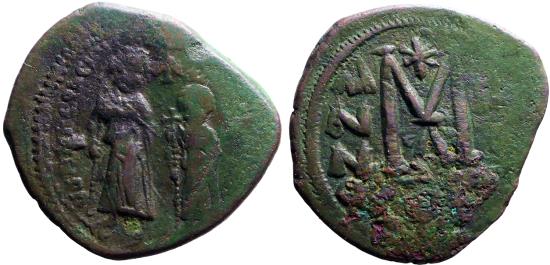 Heraclius & Heraclius Constantine AE32 Follis. Constantinople Obv: Heraclius, on left, and Heraclius Constantine, on right, each wearing crown and chlamys and holding globus-cruciger; cross above. Rev: Large M; Christogram above, A/N/N/O. Year 3. SB 834. 610-641 AD. 12.33g |