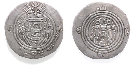 ARAB-SASANIAN, AL-HAJJAJ B. YUSUF Drachm, DA+P (Fasa) 71YE = 83h Obverse: In second and third quadrants of margin: bismillah – my (in Pahlawi) Reverse: Pellets to either side of top star-and-crescent, da to right, p to left of base of fire-altar References: SCC 131; Silver Hoard of Damascus 118; Curiel, R., 'Monnaie d'al-Hajjaj b. Yusuf à legende pehlevie,' Revue Numismatique, 1966, pp.321-328 . Both al-'Ush and Curiel proposed that the letters Pahlawi letters mn in the obverse margin may be an abbreviation for the Arabic Mansur, but offered different suggestions as to its significance. Curiel, who had access to a pierced and badly-preserved specimen, read the date as 79h and so identified 'Mansur' as a finance official known to have been active in Fars and Sistan between 75-82h. However, al-'Ush was able to demonstrate that the year should in fact be read as 71 – a Yazdigerd Era date equating to 83h, which would appear to be too late to coincide with Curiel's administrator. Instead, he proposed that 'Mansur' was an adjective meaning 'Victorious,' and pointed out that this coin was struck in the year when al-Hajjaj recaptured Darabjird from the rebellious 'Abd al-Rahman b. Muhammad. This also offers an explanation as to why al-Hajjaj's name is rendered not in Arabic but in Pahlawi, as on the coins issued there in the previous year by his recently-defeated opponent. (28mm, 3.69g). |