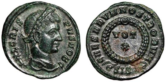 Crispus as Caesar Siscia Mint 321-324 AD Obverse: IVL CRIS-PVS NOB C Head of Crispus, laureate, right Reverse: CAESARVM NOSTRORVM around wreath containing VOT X; (gamma)SIS(thunderbolt) in exergue References: RIC 172 Size: 20mm, 3.07g Professional Numismatic Notes: Sharp detail around extremely-fine! Some cleaning scratches, but overall a pleasing marbled green and silvering patina!