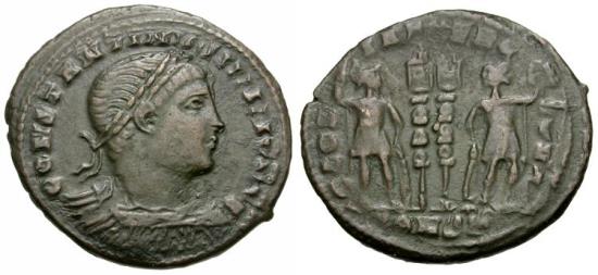 Title: Constantius II, as Caesar (AD 324-337) Imitative Æ4 / Soldiers
