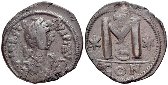 Anastasius I (491-518). Æ 40 Nummi (35mm, 18.95g, 6h). Constantinople, 498-518. Diademed, draped and cuirassed bust r. R/ Large M; cross above, star to l.; E/CON. MIBE 27; DOC 23i; Sear 19. Good Fine