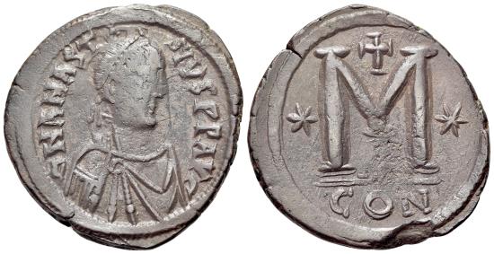 Anastasius I (491-518). Æ 40 Nummi (35mm, 18.71g, 6h). Constantinople, 498-518. Diademed, draped and cuirassed bust r. R/ Large M; star to l. and r., cross above, A/CON. MIBE 27; DOC 23a; Sear 19. VF