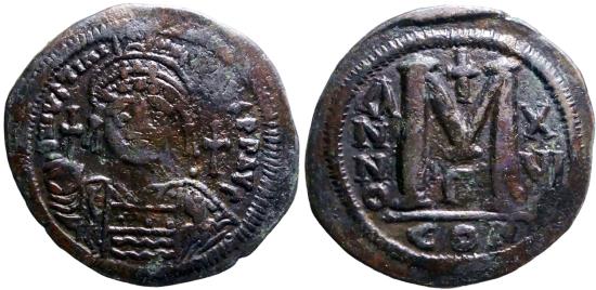 Justinian I AE35 Follis. Facing bust. Constantinople. year 16