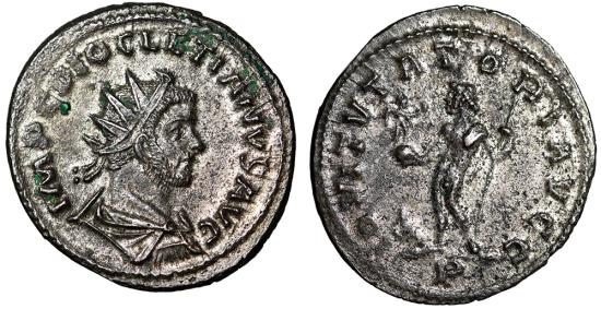 DIOCLETIAN SILVERED ANTONINIANUS Lugdunum (Lyons) Mint 287-289 AD Obverse: IMP C DIOCLETIANVS P F AVG Radiate, draped and cuirassed bust of Diocletian to right, seen from behind Reverse: IOVI TVTATORI AVGG Jupiter standing left, holding Victory on globe in his right hand and long scepter with his left; to left at feet, eagle; P in exergue References: RIC 53 Size: 23mm, 3.42g Professional Numismatic Notes: About extremely-fine and well-silvered! A scarce type!