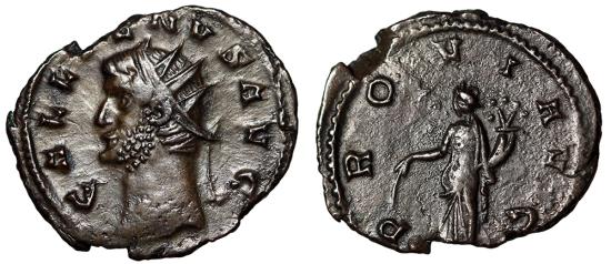 GALLIENUS ANTONINIANUS Rome Mint 260-268 AD Obverse: GALLIENVS AVG Head of Gallienus, radiate, left Reverse: PROVI AVG Providentia, draped, standing left, holding baton in right hand and cornucopiae in left hand; at her feet, globe References: RIC 267 Very Rare Portrait Variety Size: 21mm, 3.30g Professional Numismatic Notes: A very rare variety with the portrait facing left!