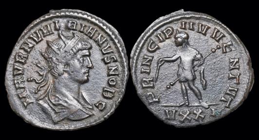 rev: PRINCIPI IVVENTVT, Numerian, draped, cuirassed, standing or walking left, holding baton in right hand and sceptre in left hand; VXXI in exergue RIC 366 |