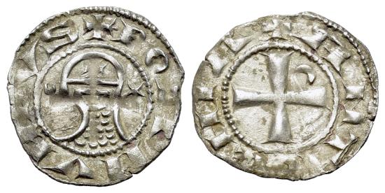 Crusaders, Antioch. Bohemund III (1163-1201). AR Denier. Helmeted and mailed head R/ Cross