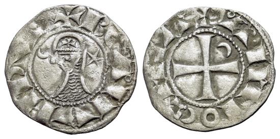 Crusaders, Antioch. Bohemund III (1163-1201). AR Denier (16mm, 0.80g., 4h). Helmeted and mailed head l.; crescent before, star behind. R/ Cross pattée; crescent in second quarter. Cf. CCS 70. VF
