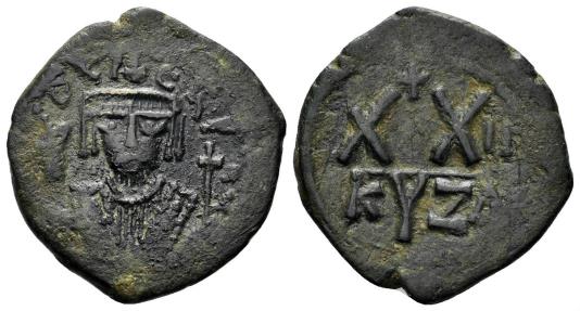 Phocas. 602-610. AE Half Follis (5.52 gm, 25mm). Cyzicus mint. Dated RY 2 (603/4). Obv.: δ M FOCAS PЄRP AVG, crowned bust facing, wearing consular robes and holding mappa and cross. Rev.: Large XX; cross above, II to right; CVZA in exergue. SB 670. VF.