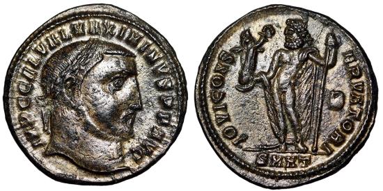 MAXIMINUS II DAIA SILVERED FOLLIS Heraclea Mint 312-313 AD Obverse: IMP C GAL VAL MAXIMINVS PF AVG Laureate head right Reverse: IOVI CONSERVATORI Jupiter standing left, holding Victory on globe and scepter; B right; SMHT in exergue References: RIC Unrecorded Variety Rare Size: 22mm, 4.59g Professional Numismatic Notes: Extremely-fine and a RIC unrecorded variety!