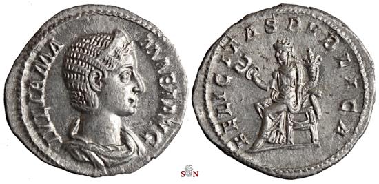 Julia Mamaea Denarius, struck AD 230 at Rome mint.