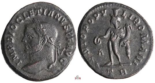 Diocletian Follis, struck AD 298-299 at Trier mint. Obv: IMP DIOCLETIANVS P F AVG, laureate head left. Rev: GENIO POPV-LI ROMANI / Α - ✱ / TR, The Genius