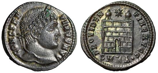 CONSTANTINE I THE GREAT Cyzicus Mint 325-326 AD Obverse: CONSTANTINVS AVG, laureate head right Reverse: PROVIDENTIAE AVGG, campgate with two turrets, no doors, star above; SMK(Delta)(Dot)in exergue References: RIC 34 Size: 20mm, 2.40g Professional Numismatic Notes: Extremely-fine and choice! Even more attractive in hand!