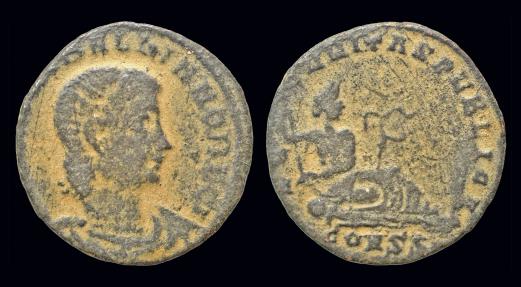 Hannibalianus (336-337AD) AE follis- 1,14 gram- 14 mm, Constantinople mint, struck 336-337AD, struck as Rex regum under Constantine I obv: FL HANNIBALLIANVS REGI, bare-headed, draped and cuirassed bust of Hannibalianus to right rev: SECVRITAS PVBLICA/ CONSS, Euphrates seated right on ground, holding sceptre, overturned urn at his side, from which water flow, reed in background, mintmark CONSS RIC VII Constantinople 147 C 2 Sear 16905 A decent issue of this scarce ruler! |