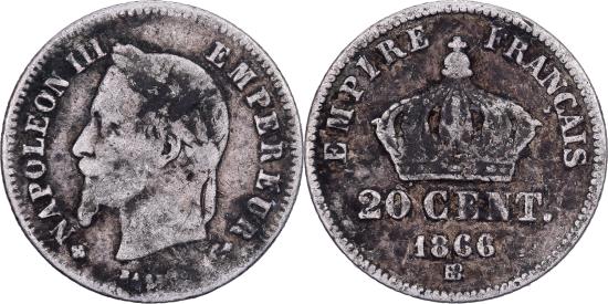 | | France, Napoleon III, 20 Centimes, 1866, Strasbourg, Small flan, Silver | | | Laureate head left, Crown above denomination, Small Flan 15 mm, NAPOLEON III EMPEREUR, EMPIRE FRANÇAIS | | FEATURES |