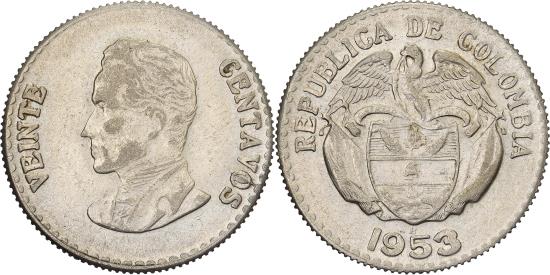 | | Colombia, 20 Centavos, 1953, Silver, , KM:213 | | | Arms, date below, Bust of Simon Bolivar left, divides denomination, REPUBLICA DE COLOMBIA // 1953, VENTE - CENTAVOS | | FEATURES |