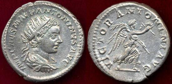 good surfaces & eye appeal AR Antoninianus 22mm 4.75 grams O:Elagbalus crowned with draped bust right IMP CAES M AVR ANTONINVS AVG R:VICTOR ANTONINI AVG, Victory advancing right Catalog reference: S#2090, RC #7500
