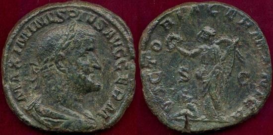 AE Sesterius 31mm, 19.9 grams Victory over Germanic tribes O:MAXIMINUS PIUS AVGG GEM laur. bust MAXIMINUS facing right R: VICTORIA GERMANICA SC, Victory standing left holding wreath & palm. bound German captive seated at feet. Excellent Eye appeal with sharp details and very nice patina... exceptional condition