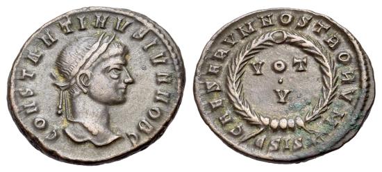 Constantine II (as Caesar, 316-337). Æ Nummus (18mm, 2.77g, 6h), Siscia, 320-321. CONSTANTINVS IVN NOB C Laureate, draped and cuirassed bust of Constantine II to right. R/ CAESARVM NOSTRORVM / ЄSIS✱ around wreath containing VOT / V in two lines. RIC 163. Good VF