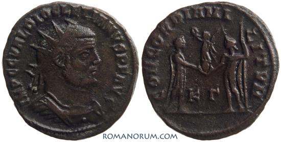 Emperor standing right, receiving Victory on globe from Jupiter, standing left, holding sceptre. KΓ in field.