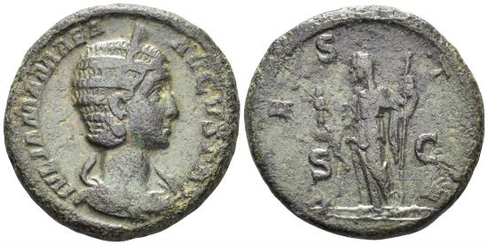 Julia Mamaea, Augusta. 222-235 AD. AE As (11.09g, 25.5mm). Rome mint. Struck 226 AD. Obv.: IVLIA MAMAEA AVGVSTA, diademed and draped bust right. Rev.: VESTA S-C, Vesta standing left, holding Palladium and sceptre. RIC 709. VF.