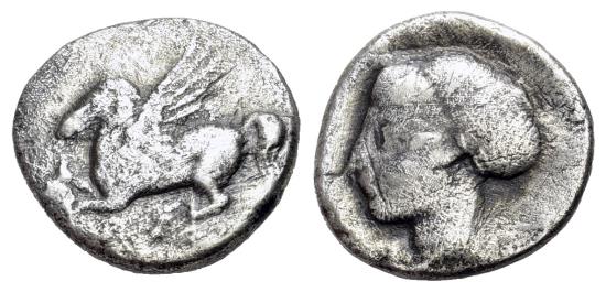 CORINTHIA. Corinth (Circa 350/45-285 BC). AR Drachm. Pegasos flying. R/ Head of Aphrodite
