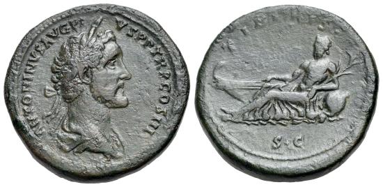 Antoninus Pius (AD 138-161). Æ Sestertius (34mm, 29.13g, 12h). Rome mint. Struck circa AD 141-143. ANTONINVS AVG PI VS P P TR P COS III, laureate and draped bust right R/ TIBERIS, S C in exergue, Tiber reclining left on overturned urn from which water flows, resting hand on boat and holding reed. RIC III 642b; Banti 415. . VF,