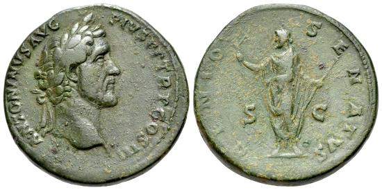 Antoninus Pius (138-161). Æ Sestertius (33mm, 22.34g, 12h). Rome, 141-3. Laureate head r. R/ Genius of the Senate standing l., holding branch and sceptre. RIC III 605. Green patina, Good VF