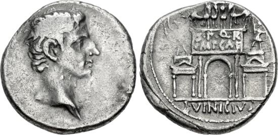 The triumphal arch on the reverse of this denarius celebrates Augustus' diplomatic victory in 20 B.C. that saw the return of the military standards previously captured by the Parthians during the failed campaign of Marcus Crassus and Mark Antony. The Parthian Arch is actually an arch originally erected in the Roman Forum to celebrate the emperor's victory over Antony and Cleopatra at the Battle of Actium in 31 B.C.