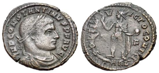 Constantine I (AD 307/310-337). Æ Follis (20mm, 3.21g., 6h). Arelate (Arles) mint, 1st officina. Struck AD 315. Laureate, draped, and cuirassed bust right. R/ Sol standing left, raising right hand and holding globe; T|F//PARL. RIC VII 72; Ferrando 200 (R3). Brown patina, VF, Very Rare