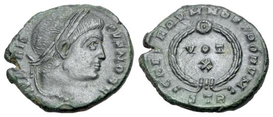 Crispus (as Caesar, AD 317-326). Æ Nummus (18mm, 2.86g, 6h). Treveri. IVL CRISPVS NOB C, laureate bust right. R/ CAESARVM NOSTRORVM, laurel wreath around VOT • X in three lines; STR in exergue. RIC VII, 431. Green patina, VF