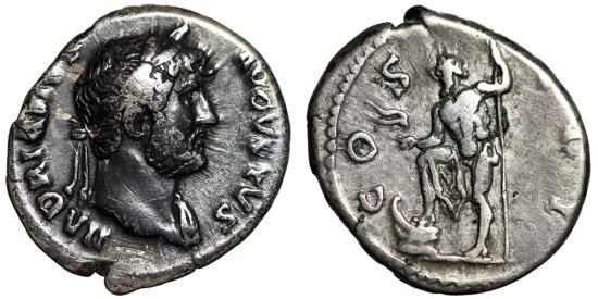 HADRIAN AR DENARIUS Rome Mint 125-127 AD Obverse: HADRIANVS AVGVSTVS Head of Hadrian, laureate, right Reverse: COS III Neptune stepping on prow left, holding acrostolium and trident References: RIC 788 Size: 19mm, 3.21g Professional Numismatic Notes: Good-fine and toned; deeply toned on obverse